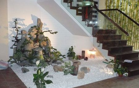 - Tiểu cảnh cầu thang khô: thường thích hợp với kiểu cầu thang dốc vừa phải. Vì nó có thể thay thế cho khoảng trống tối tăm dưới chân cầu thang bằng ánh đèn, đá sỏi trắng và xung quanh là những cây cỏ tạo cảm giác xanh mát. Có thể sử dụng thêm các con vật như: hươu, nai, vịt hay tượng người, nhà cửa để tạo điểm nhấn cho tiểu cảnh.