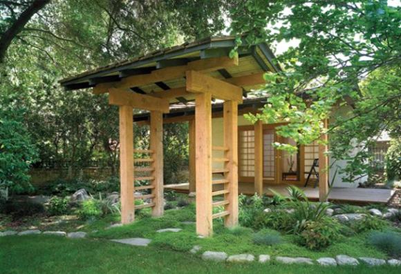 - Nhà uống trà là một trong những không gian không thể thiếu được trong các khu vườn Nhật. Đó có thể chỉ là một căn nhà nhỏ hết sức đơn giản làm nơi thư giãn với hoặc quây quần cùng gia đình hoặc bạn bè của bạn. Để tạo những tầm nhìn tuyệt vời cho nhà trà, các cửa sổ nên được hướng ra những cảnh yên bình trong vườn, như vườn đá Nhật Bản, lồng đèn hay vườn Zen. Hãy trang trí ngôi nhà với một số loại cây, hoặc hoa đẹp mắt để tạo sự hài hòa với thiên nhiên bên ngoài.