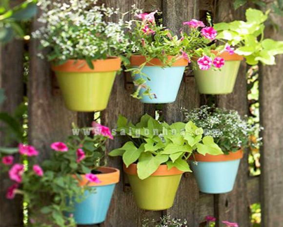 Nếu khu vườn của bạn không đủ rộng thì bạn có thể tham khảo cách sau đây nhé ! Đó là tạo một không gian nho nhỏ ngay trên chính bức tường gạch quen thuộc. Những chấn song giờ đã biến thành giá đỡ để bạn tha hồ trưng bày những chậu hao mình yêu thích. Tuy nhiên bạn nên cố định những chậu hoa với chấn song sao cho thật chặt, chắc chắn và phải có đủ độ nghiêng sao cho tự nhiên nhất nhé!