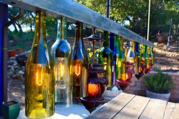 Với cách trang trí như này thì làm như sau: Bạn sẽ phải sử dụng những chiếc chân song của mình rồi tiến hành xắp sếp, treo lên đó những chiếc lọ nhiều màu sắc. để cố định chúng hãy đóng đinh vào những chấn song và sẽ độc hơn khi bạn tạo cho mỗi chiếc lọ một chiếc móc treo riêng. Với đầy những màu sắc xanh, đỏ, hồng, vàng,...Sẽ cực kỳ nổi bật giữa khu vườn màu xanh lá cây ? Để khu vườn thêm lung linh vào buổi tối bạn có thể đặt trong chúng những ánh đèn hay ánh nến , không gian sẽ thêm lung linh huyền ảo mà thơ mộng.