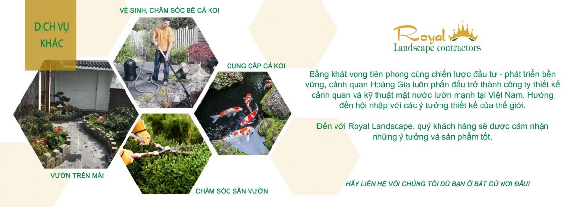 Trải qua hàng trăm công trình thực tế nên Cảnh quan Hoàng Gia đã tạo riêng cho mình một thư viện phong phú về phong cách thiết kế đủ làm hài lòng những khách hàng kỹ tính nhất. Ngoài thiết kế cảnh quan, chúng tôi còn kết hợp với việc thực hiện các lĩnh vực khác, tạo nên đa dạng sự lựa chọn cho quý khách cho công trình sân vườn của mình như thiết kế hồ cá koi, hồ non bộ, tiểu cảnh, đài phun nước, vườn đứng… mang đến cho quý khách không gian sống lãng mạn, tươi mát, gần gũi với thiên nhiên, thoải mái, thư giãn sau một ngày dài làm việc đầy mệt nhọc, áp lực,…